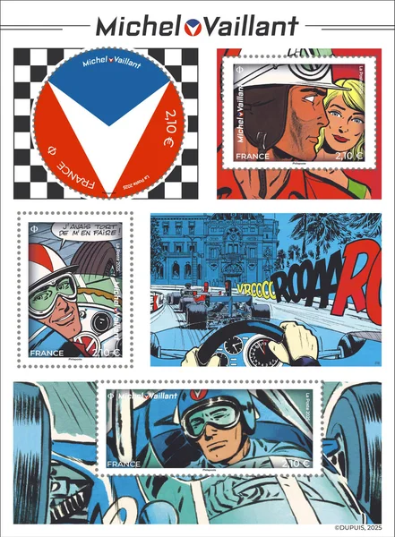 France’s stamp block pays tribute to Michel Vaillant, the iconic racing driver and comic book legend whose legacy spans over six decades of motorsport and narrative brilliance. Conceived by Jean Graton, Vaillant personifies velocity, honor, and a rebellious edge.